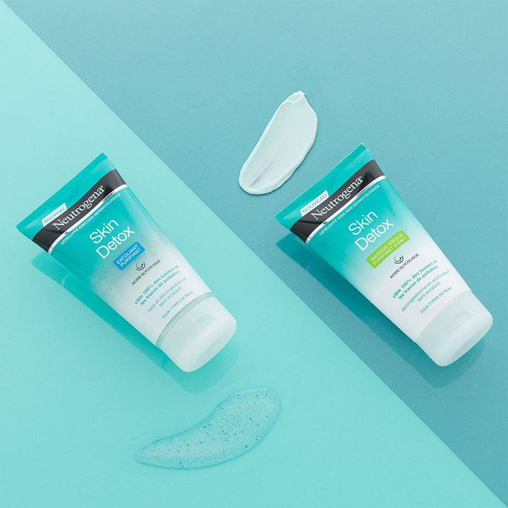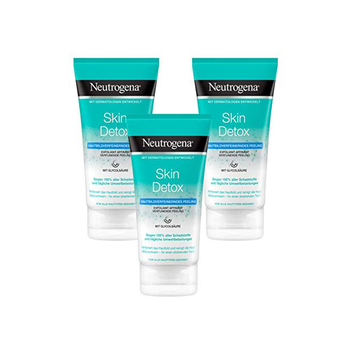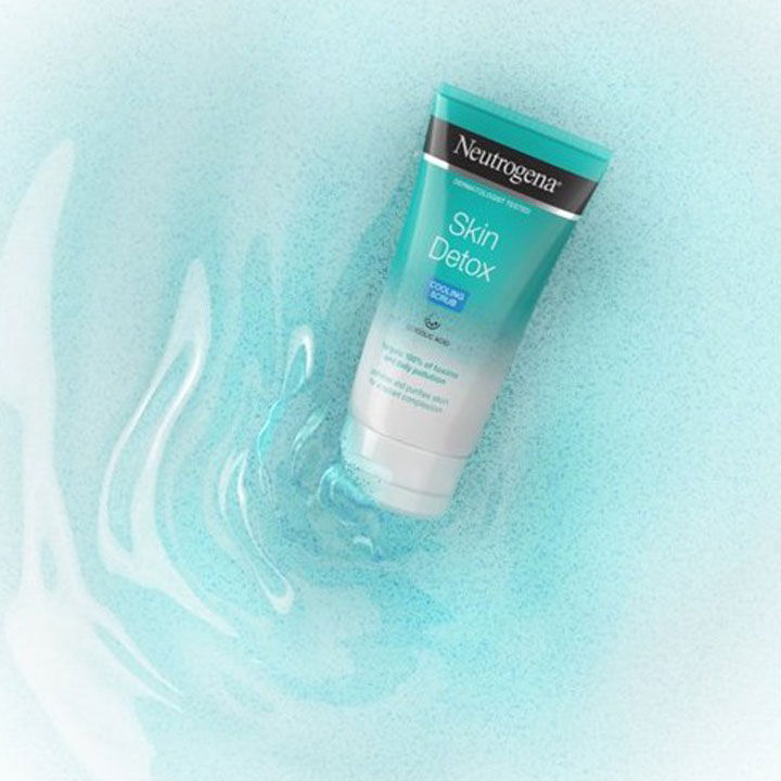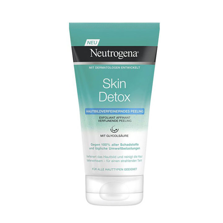 - Gel tẩy da chết Neutrogena Skin Detox có công thức chứa axit glycolic giúp nhẹ nhàng loại bỏ da chết, các hạt bụi bẩn, bã nhờn và tàn dư trang điểm mà không làm khô da. Đồng thời giúp thải độc cho da, ngăn ngừa tắc nghẽn lỗ chân lông.